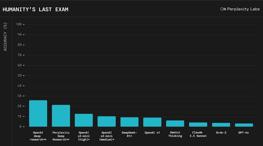 Deep Research on Perplexity achieved 21.1% accuracy on Humanity’s Last Exam, outperforming several leading AI models. This benchmark evaluates AI across 3,000+ questions in 100+ subjects, including math, science, history, and literature.