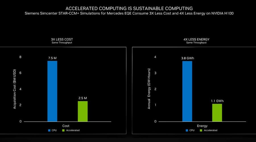 Siemens teamed with Mercedes to analyze aerodynamics and related acoustics for its new electric EQE vehicles. The simulations that took weeks on CPU clusters ran significantly faster using the latest NVIDIA H100 GPUs. In addition, Hopper GPUs let them reduce costs by 3x and reduce energy consumption by 4x.